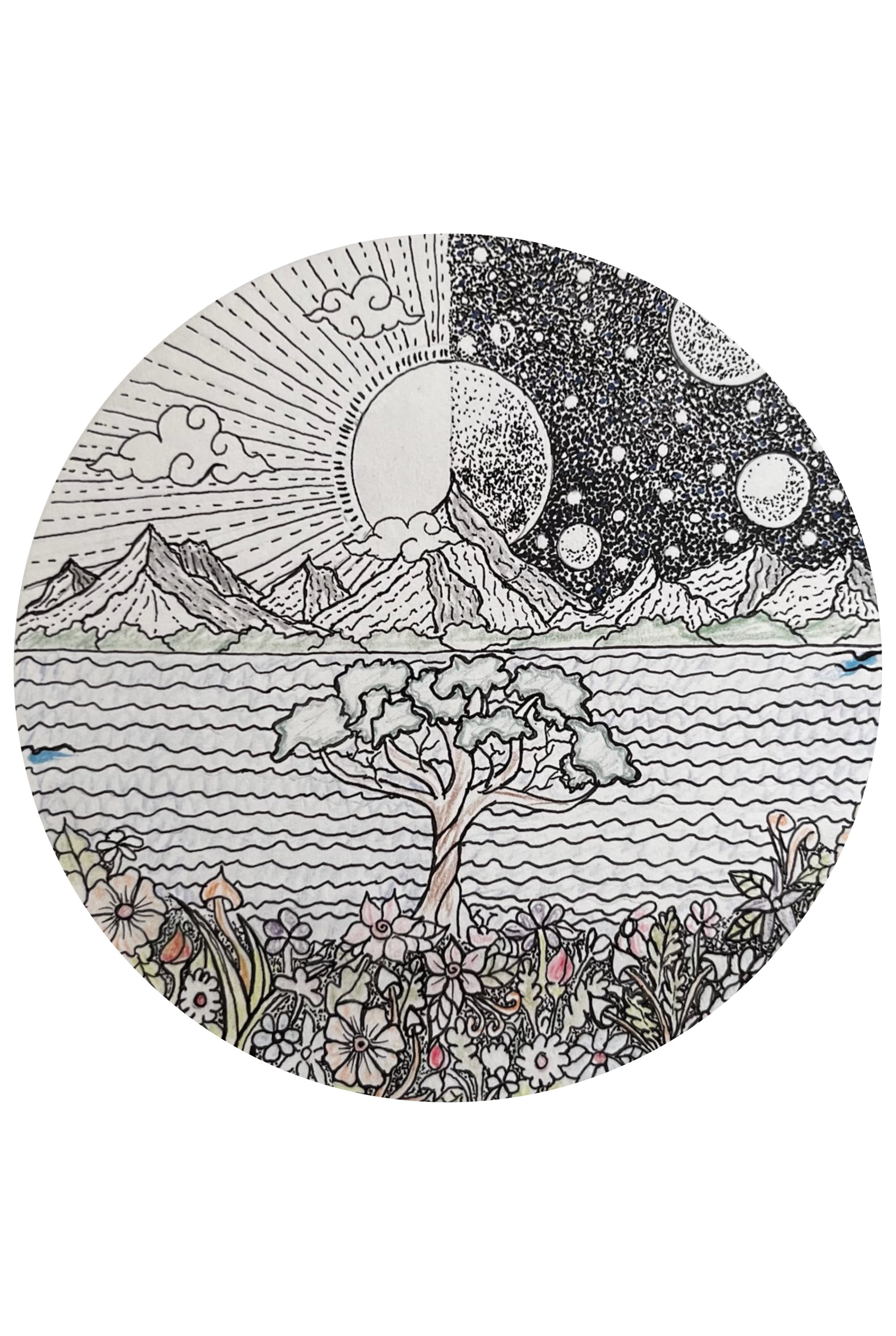 The cycle of being. Circle of Duality is an intricate meditation on the interconnectedness of all things, from the mountain peaks to the blooming valleys.