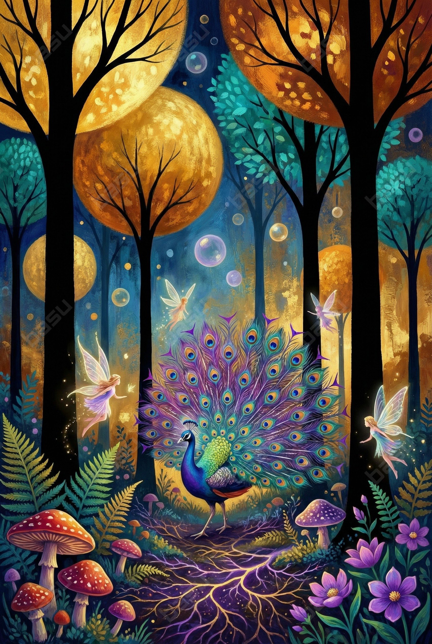 A vision of forest warmth. The Golden-Glow Peacock stands elegantly at the heart of a sun-lit grove, surrounded by dancing fairies and lantern-like trees. With its vibrant colors and intricate textures, this illustration brings a warm, mythic energy to any space.