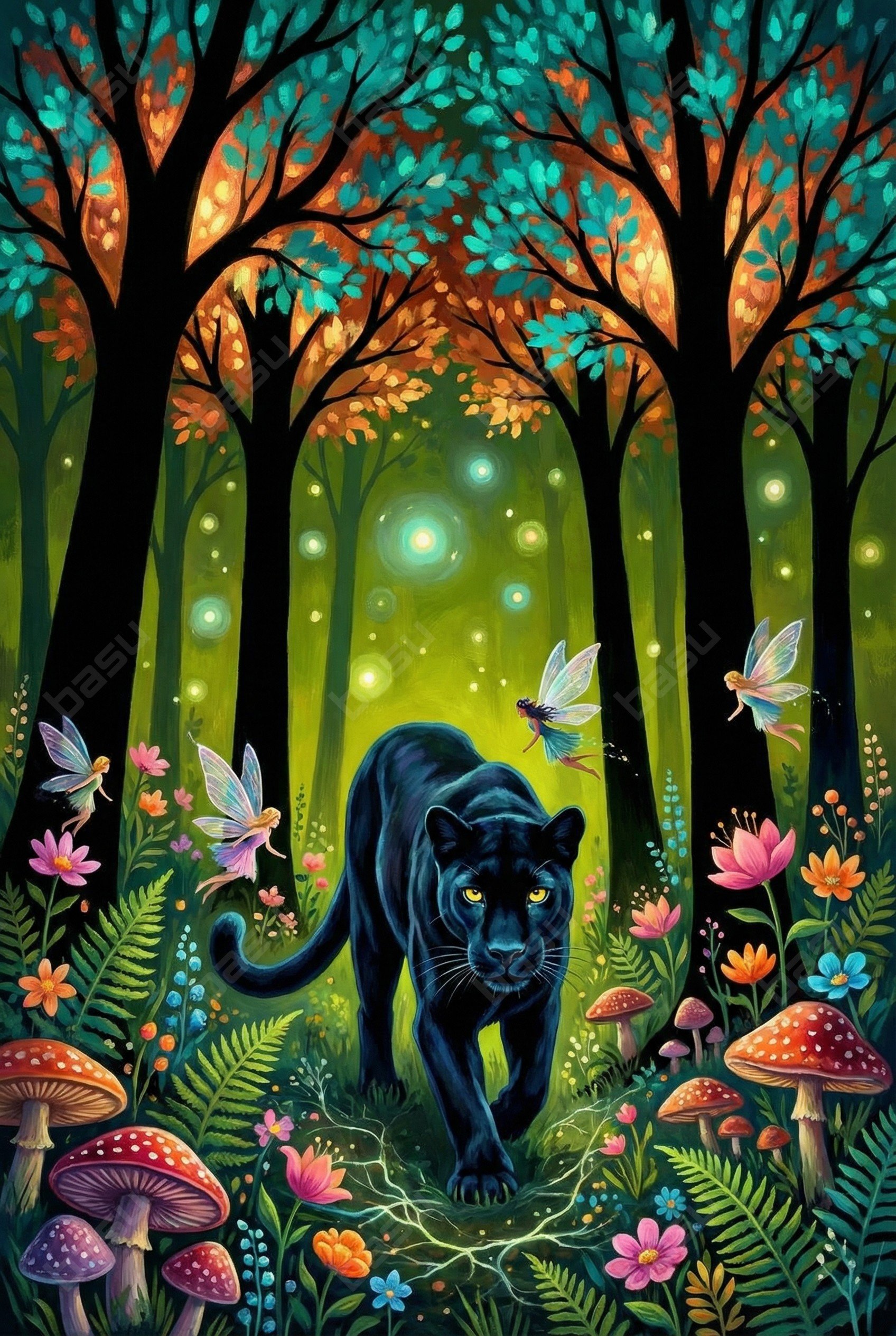 yes of the nocturnal glade. The Night Puma Watcher captures the silent authority of the forest's primary guardian. Set against a backdrop of glowing orbs and flitting fairies, this piece emphasizes the watchful protection offered by the mythic workforce under the cover of night.
