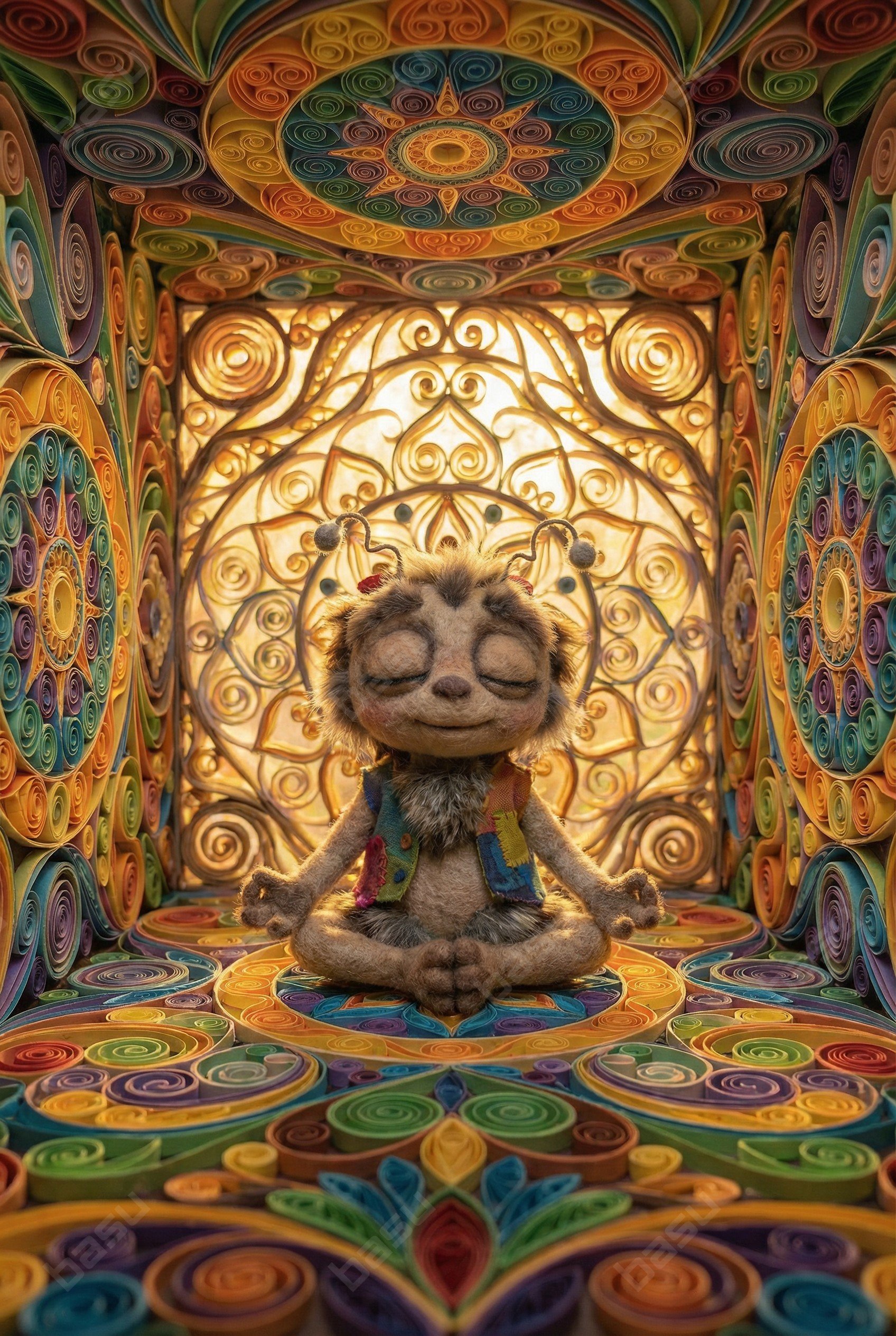 A centerpiece of quietude. The Quilled-Mandala Meditator represents the pinnacle of focus within the mythic forest. Surrounded by perfectly symmetrical paper-quilled patterns and soft, back-lit light, this piece captures the expansive beauty of internal peace.
